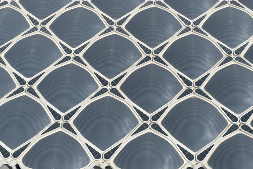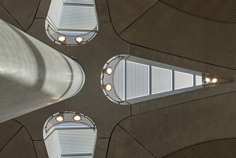 hojas de una palma del desierto y las inundaciones luz del vestíbulo a través de rayos divididos en las uniones de columnas. haciéndose eco de las venas de una hoja, un patrón geométrico basado en las formas tradicionales islámicos se aplica a cada plafón expuesto. la compleja geometría de las cúpulas y la estrategia de fabricación se ha desarrollado en colaboración con Foster + especialistas en geometría socios internos.